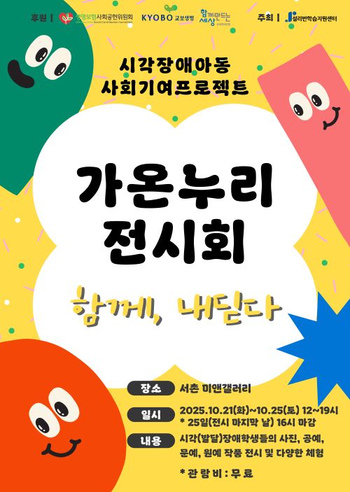 설리번학습지원센터(센터장 노형지)는 2025년 생보위와 교보생명이 지원하는 비영리부문 공익활동의 일환으로 추진된 시각발달아동청소년 역량강화 프로그램 ‘사회기여 프로젝트’의 마지막 단계인 가온누리 전시회를 오는 21일부터 25일까지 서울 종로구 미앤갤러리에서 개최한다고 밝혔다.