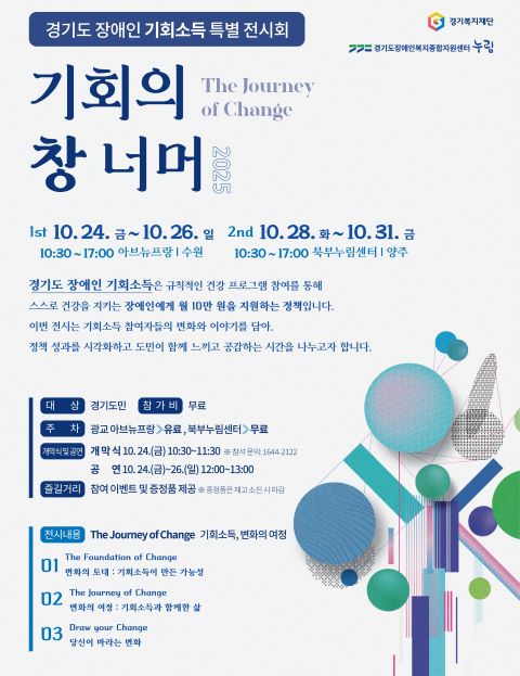 경기도장애인복지종합지원센터(이하 누림센터)는 경기도 장애인 기회소득 정책의 성과를 공유하고 도민의 공감대를 확산하기 위한 특별전시회 ‘기회의 창 너머 2025(The Journey of Change)’를 개최한다.