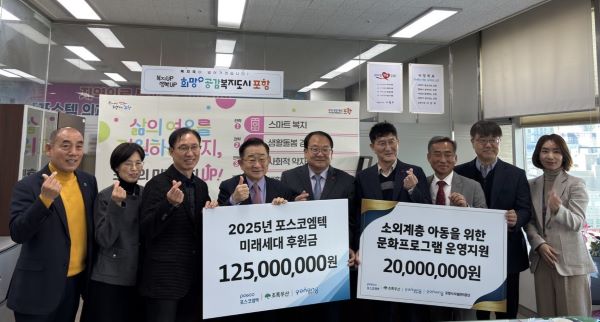 이번 전달식은 포스코엠텍이 2025년 한 해 동안 미래세대 지원을 위해 마련한 총 1억4,500만원의 후원금과 함께, 포항시 아동놀이공간인 아이조아플라자의 시청각장비 개선을 위해 추가 지원하는 2,000만원 후원금 전달식을 병행하여 진행되었다.
