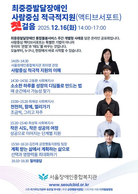 | 서울장애인종합복지관이 ‘최중증 발달장애인 사람중심 적극적 지원, 첫걸음’ 온라인 공유회를 개최한다 |