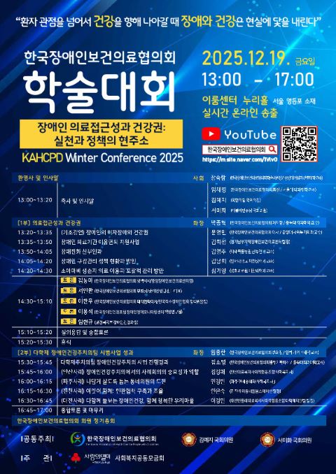 한편, 2025년도 동계 학술대회는 19일 당일 ‘한국장애인보건의료협의회’ 유튜브를 통해 온라인으로도 실시간 송출될 예정이다(https://m.site.naver.com/1VlvO).