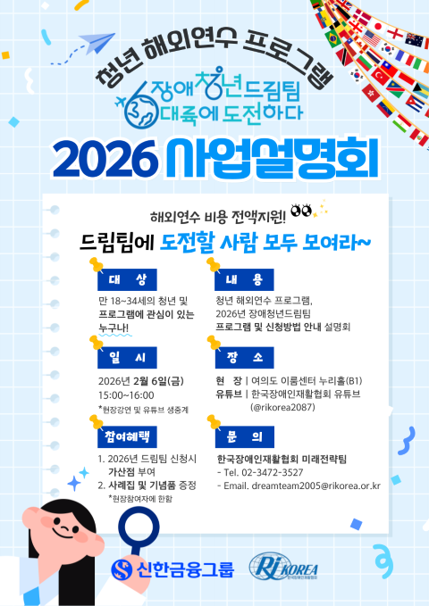 한국장애인재활협회(회장 김인규)와 신한금융그룹(회장 진옥동)이 운영하는 국내 최초·유일의 장애·비장애청년 해외연수 프로그램 ‘장애청년드림팀 6대륙에 도전하다(이하 ‘드림팀’)’가 2026년 도전자 모집을 위한 사업설명회를 개최한다
