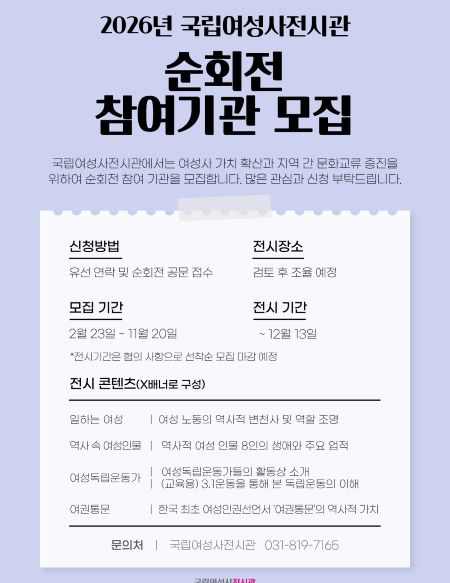 성평등가족부 산하 한국양성평등교육진흥원 국립여성사전시관(이하 여성사전시관)은 2월 23일부터 11월 20일까지 ‘2026년 국립여성사전시관 순회전’ 참여기관을 모집한다고 밝혔다.