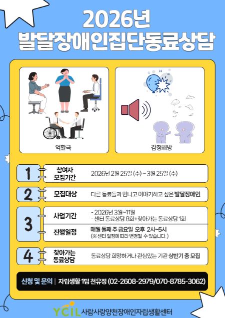 사람사랑양천장애인자립생활센터(소장 김범준, 이하 ‘양천IL센터’)는 2월 25일부터 3월 25일까지 한 달 동안 2026년 발달장애인 집단동료상담(이하 ‘발달집단동료상담’) 참여자를 모집한다. 아울러 지역사회 확산을 위한 ‘찾아가는 동료상담’은 상반기 중 참여기관을 별도로 모집할 예정이다.