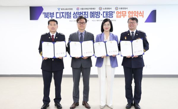 | 서울시여성가족재단은 6일 서울특별시북부교육지원청 대회의실에서 서울 노원구·도봉구 아동·청소년을 위한 디지털 성범죄 예방·대응 체계 강화를 위해 북부교육지원청, 노원경찰서, 도봉경찰서와 4차 업무협약을 체결했다. |