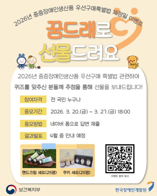 한국장애인개발원(원장 이경혜, 이하 개발원)은 중증장애인생산품 우선구매 특별법(이하 우선구매 특별법) 제정일을 맞아 오는 27일까지 ‘꿈드래*로 선물드려요!’ 온라인 이벤트를 진행한다.