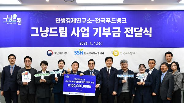 한국사회복지협의회(회장 김현훈) 전국푸드뱅크는 1일, 서울 마포구 한국사회복지협의회 회의실에서 기획예산처 박홍근 장관, 보건복지부 유주헌 사회서비스정책관, 민생경제연구소 안진걸, 임세은 소장, 김용춘 감정평가사, 민생경제연구소 윤소영 운영위원장, 박영선 국회의장 공보비서관과 안성규 드림스폰 대표자 및 관계자들이 참석한 가운데 ‘먹거리 기본보장 그냥드림 사업’ 지원을 위한 기부금 전달식을 개최했다.