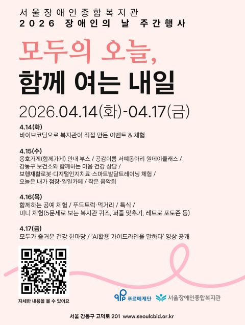 시립서울장애인종합복지관(관장 최미영)은 장애인의 날을 맞아 오는 14일부터 17일까지 나흘간 장애인의 날 주간 행사 ‘모두의 오늘, 함께 여는 내일’을 개최한다.